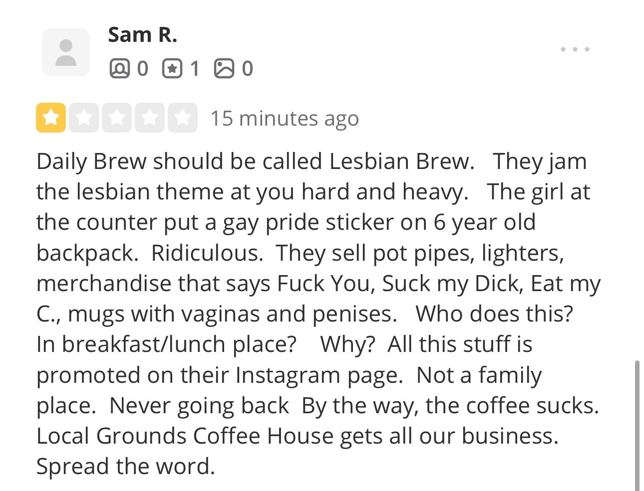 On July 21, 2025, The Daily Brew Coffee House & Lounge received a string of bad Yelp reviews from a "Sam R." who said the "Daily Brew should be called Lesbian Brew". Why? Because we "jam the lesbian theme at you hard and heavy". So in true Daily Brew fashion, we posted it to our Instagram and Facebook stories and received an overwhelming amount of people asking for LESBIAN BREW MERCH.